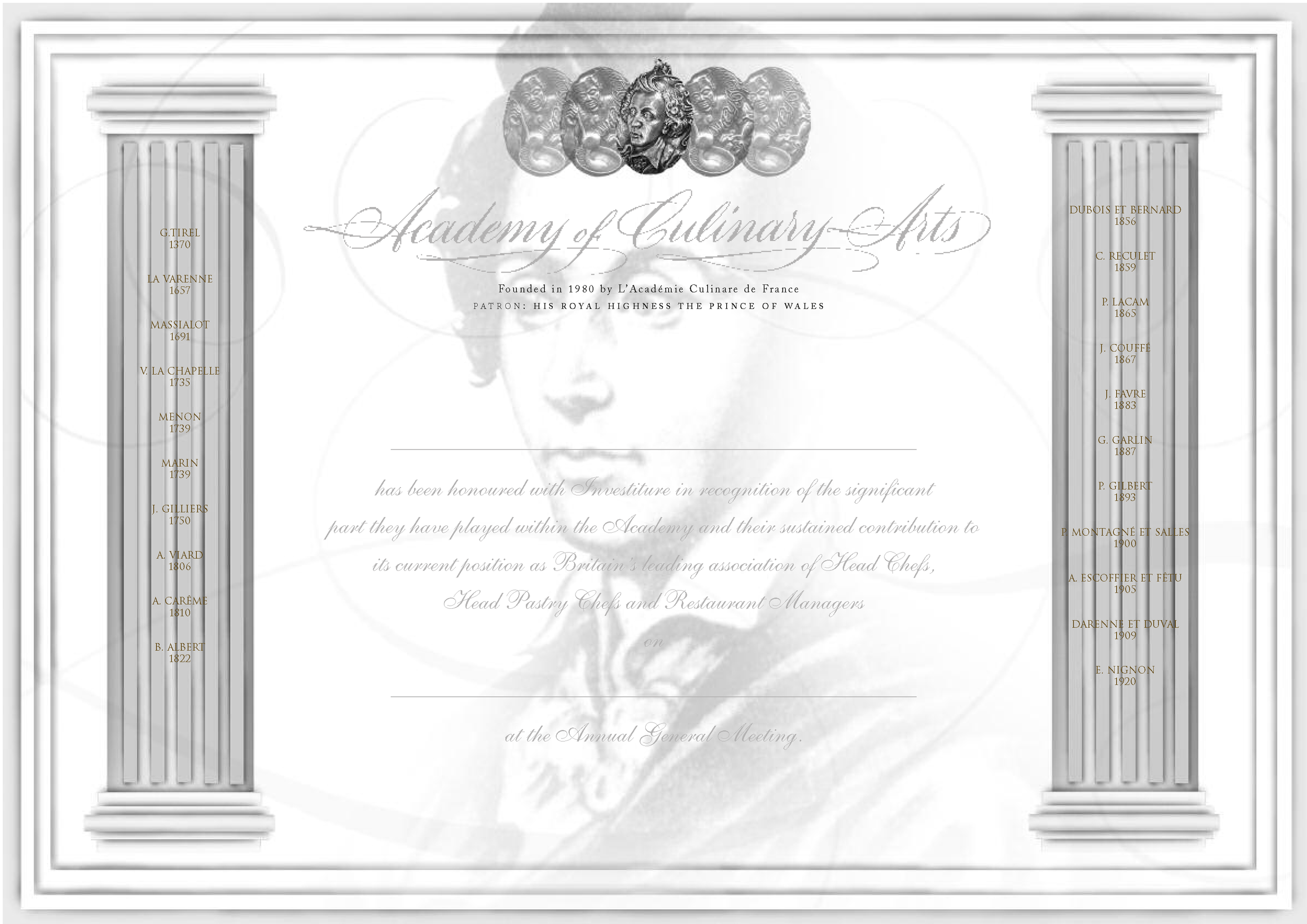 Marie-Antoine Carême, is considered to be the godfather of culinary arts. Our highest accolade that we award the Master of Culinary Arts, features his face as its emblem and our Fellows are awarded a certificate with his bust featuring in the background. Marie-Antoine Carême is our symbolic figurehead. The legacy that he created in the culinary world represents the pinnacle of excellence and mastery that your academy strives to achieve and honour.