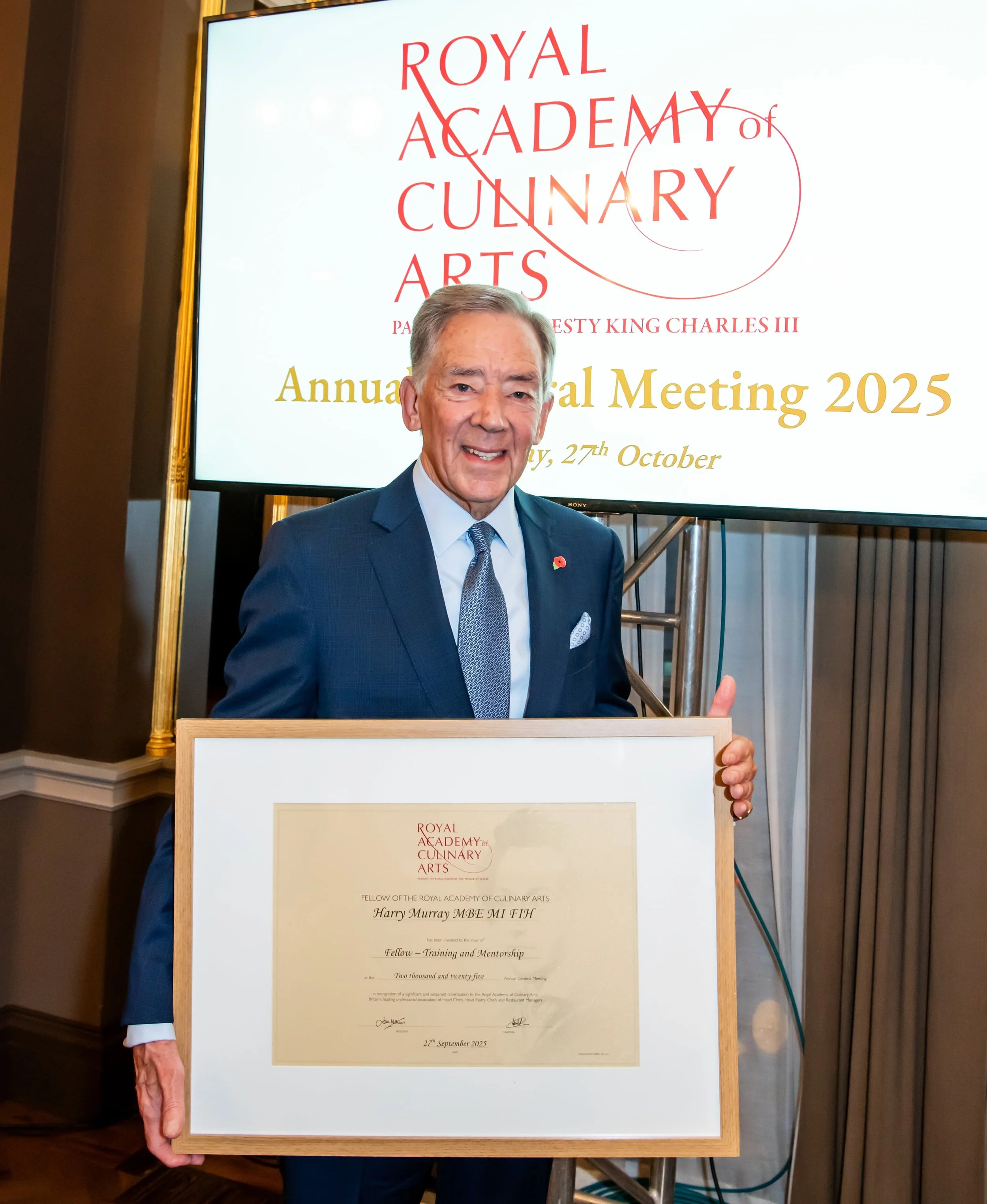 Our final investiture this evening belongs to a hospitality superstar – and we are delighted to be presenting a Royal Academy of Culinary Arts Fellowship to Harry Murray MBE.
